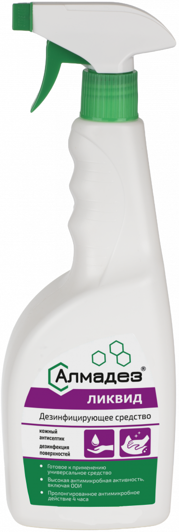- Может использоваться для пропитывания на месте сухих салфеток, помещенных в Диспенсерную систему «Алмадез», и дальнейшего применения их для очистки и дезинфекции поверхностей методом протирания согласно утверждённой инструкции по применению.
